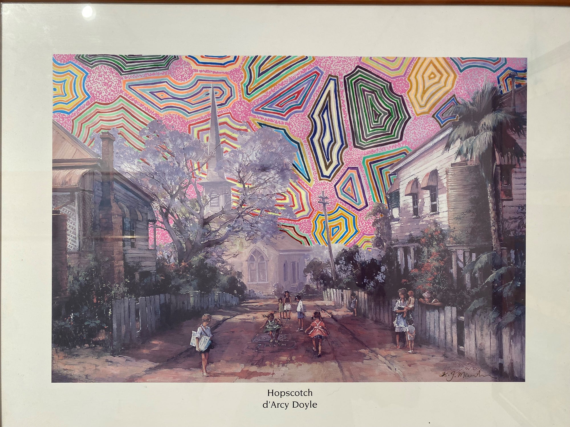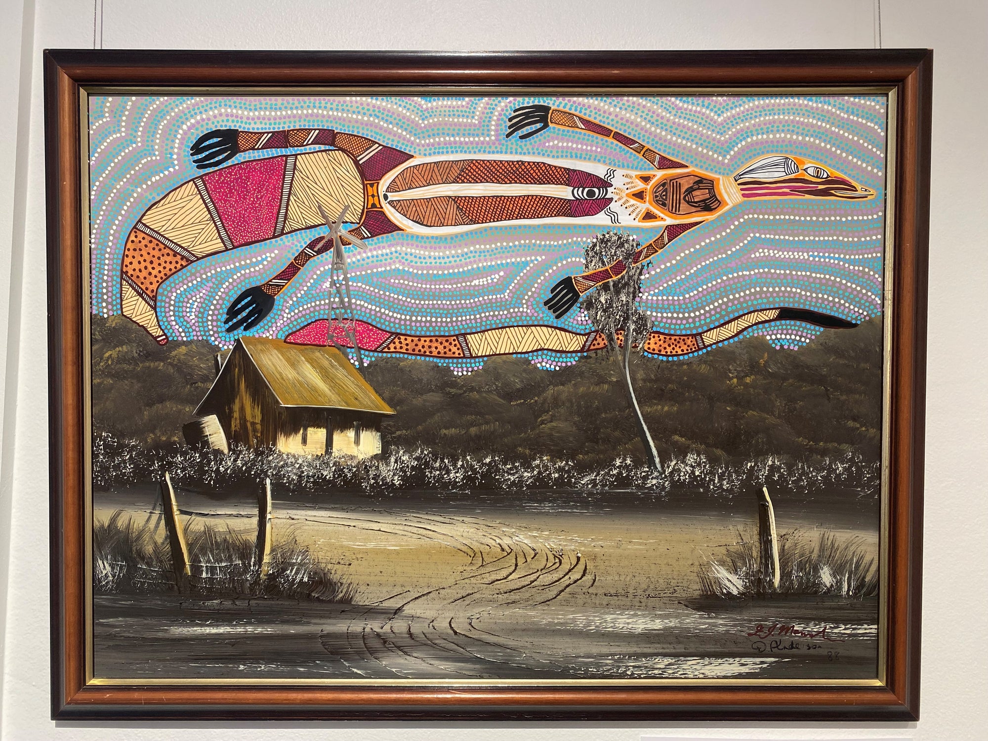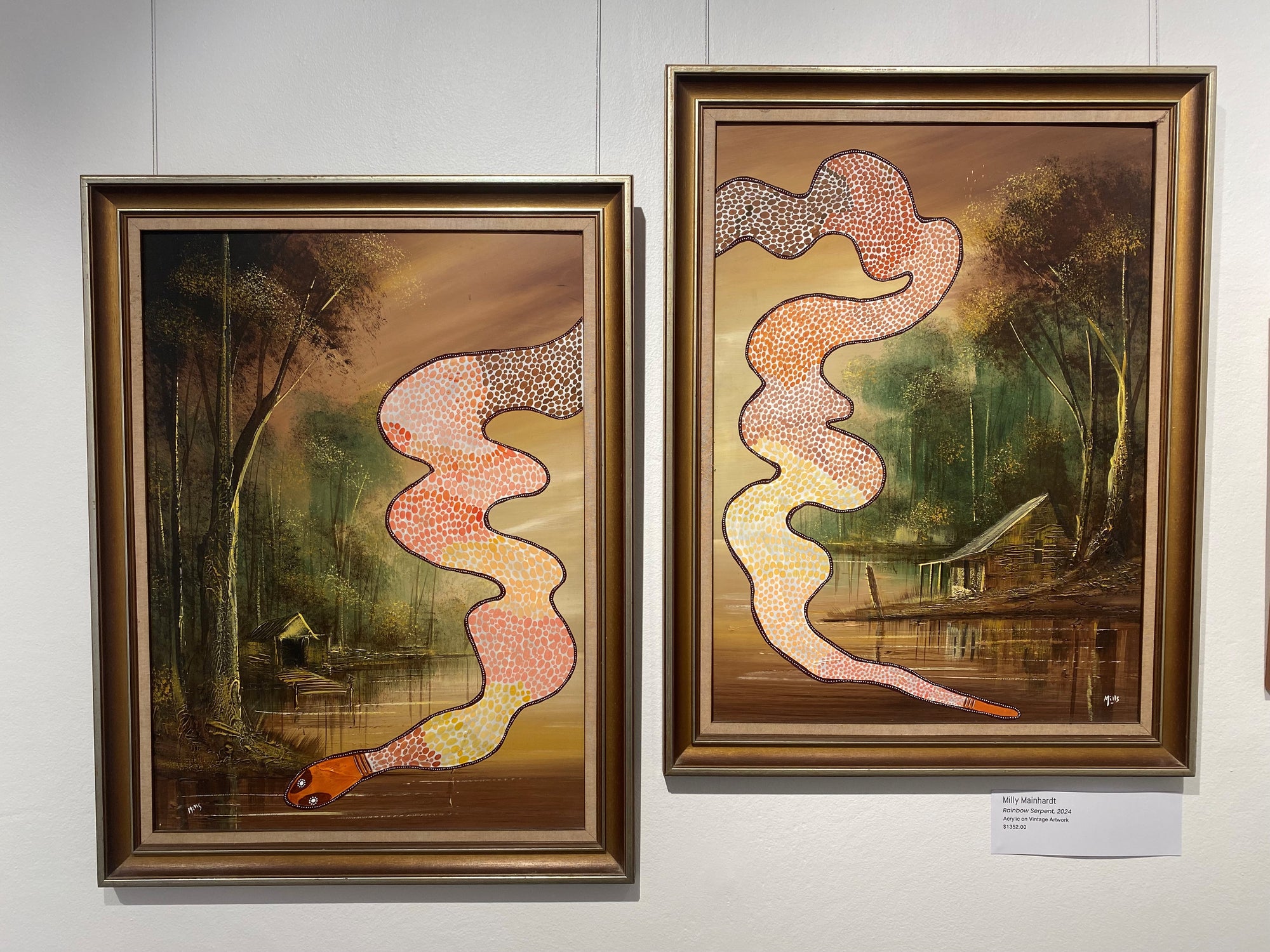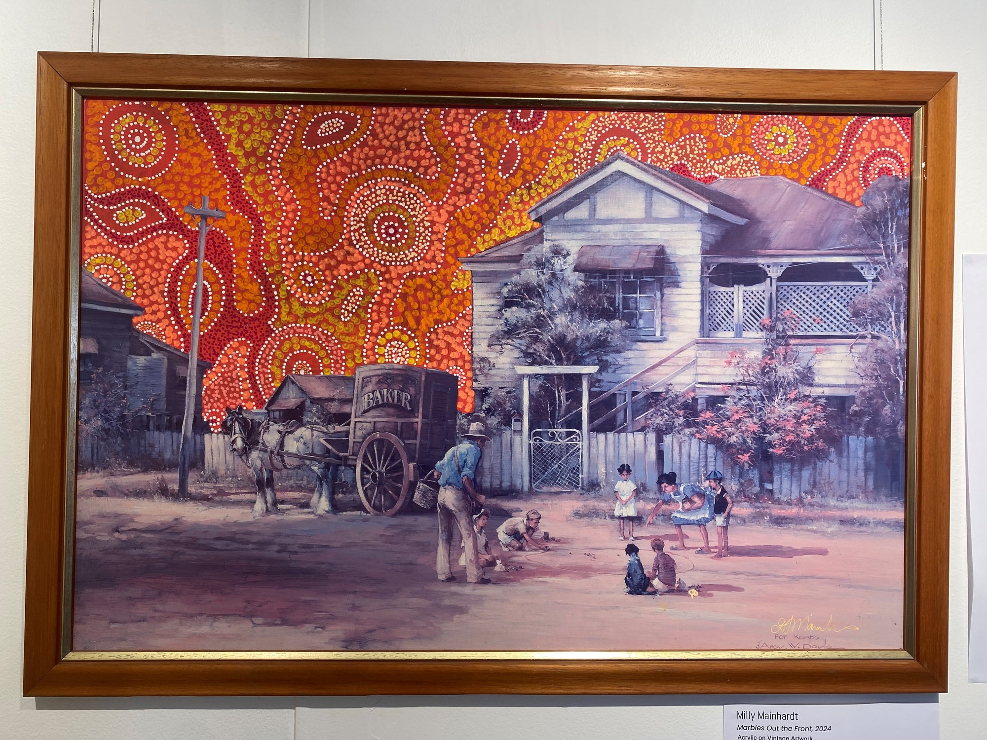 This is a series of acrylic on top of oil paintings, these oil paintings have been sourced from; op shops, estate sales, some gifted from family members garages, eBay or garage sales. They depict typical Australian scenes ( old farm homes, kids playing cricket in the street (all white children), stockmen on horses or old Queenslander homes). I've added some of my magic to them and dotted over the sky, background or wrapping around the trees.