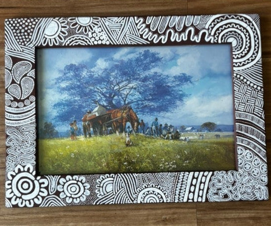 This is a series of acrylic on top of oil paintings; the oil paintings depict typical Australian scenes ( old farm homes, kids playing cricket in the street (all white children), stockmen on horses or old Queenslander homes). I've added some of my magic to them and dotted over the sky, background or wrapping around the trees.