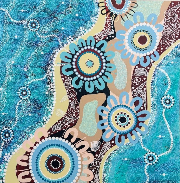 My artwork reflects the deep connection between the land and where the waterways meet. The flowing lines and colours celebrate the beauty of country drawing from both their textures and rhythms. It brings together the strength of community living today while honouring our elders who kept our culture alive.