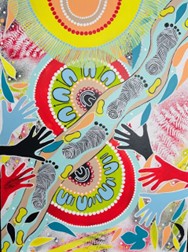 This artwork celebrates the historical significance of our culture. The softness of flora resembling the cave and rock drawings from thousands of years ago. The layering up of my artwork bringing past to the present with handprints symbolizing strength of our people and footprints following the footsteps of our ancestors. The legacy of our culture preserved and passed on to share to future generations from our elders as we sit with mob. My vision portrays moving forward learning and sharing stories of our heritage and traditions in a vibrant colour palette on a path with confident and purposeful footsteps, remembering and celebrating each and every milestone as we embrace our future.